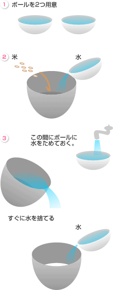 最初に水を素早く入れ替えるのが美味しく研ぐ秘訣です。この1〜2回の間に、乾燥したお米はかなりの水分を吸収するので、ボールに水をためてきれいな水を吸わせなくてはなりません。水道の蛇口から水を入れるのでは間に合わないと料理長はおっしゃっていました。 もちろん、とぎ汁はもったいないので、植木にかける水に再利用してくださいね! |