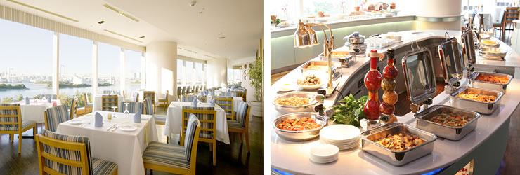 東京湾に面した明るい雰囲気の店内には、シェフ厳選のメインディッシュを始め、新鮮な有機野菜を使用したサラダや、ホテルメイドのスイーツを種類豊富にご用意しております。