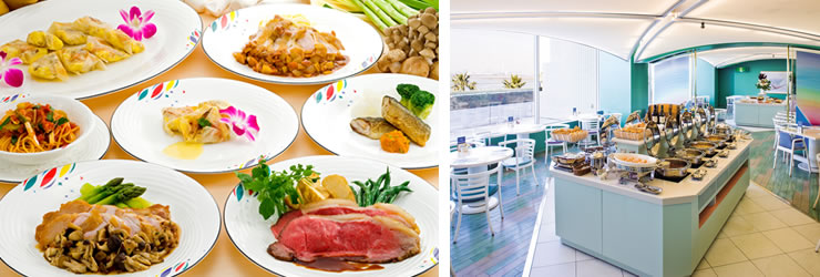 ヨットクラブハウスをモチーフにしたカジュアルな雰囲気のオールデイダイニングです。約50種類のブッフェメニューが勢揃いする人気のブッフェをお楽しみください。